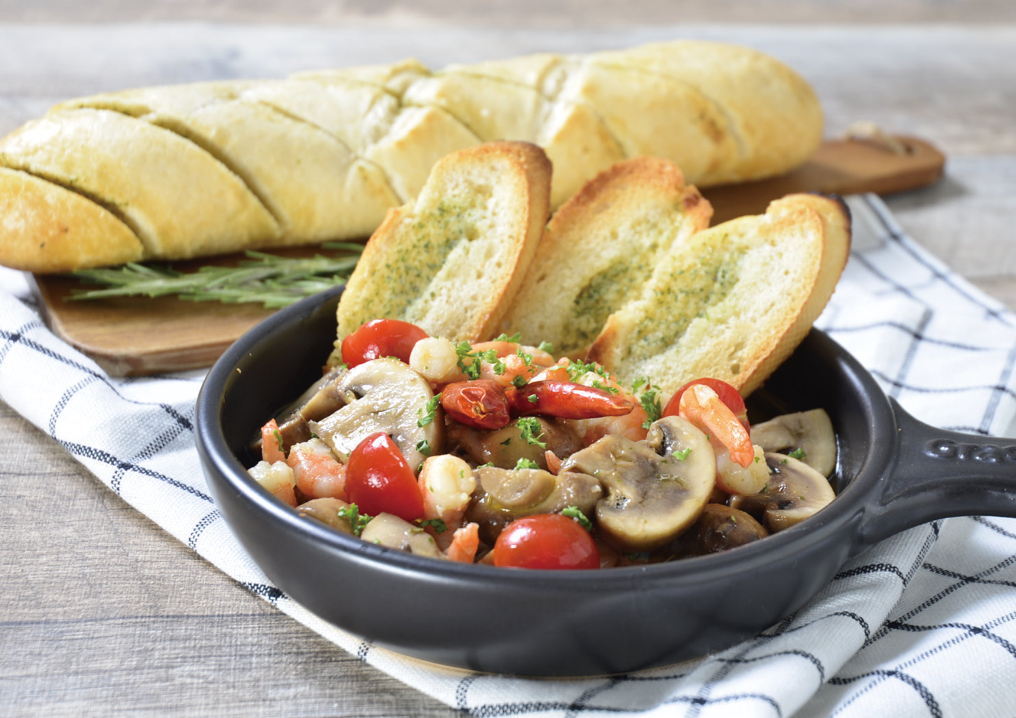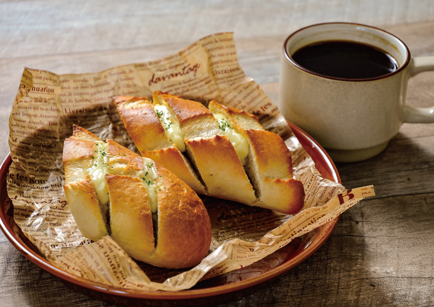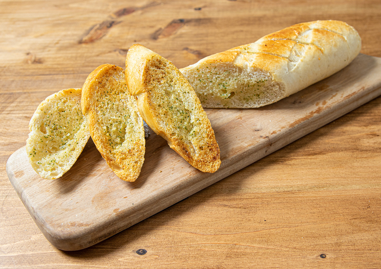 外はカリッと中はふんわりもちもちしたフランスパンに、切れ目を入れガーリックバターを塗りこみました。軽く焼くだけで本格的なフランスパンを楽しめます。