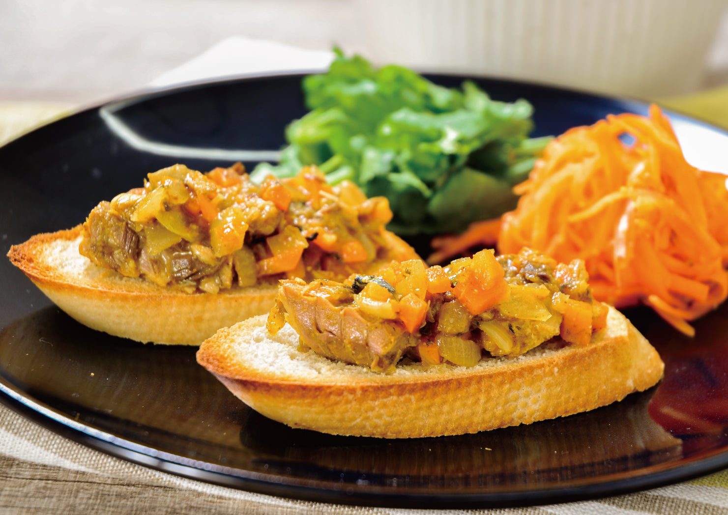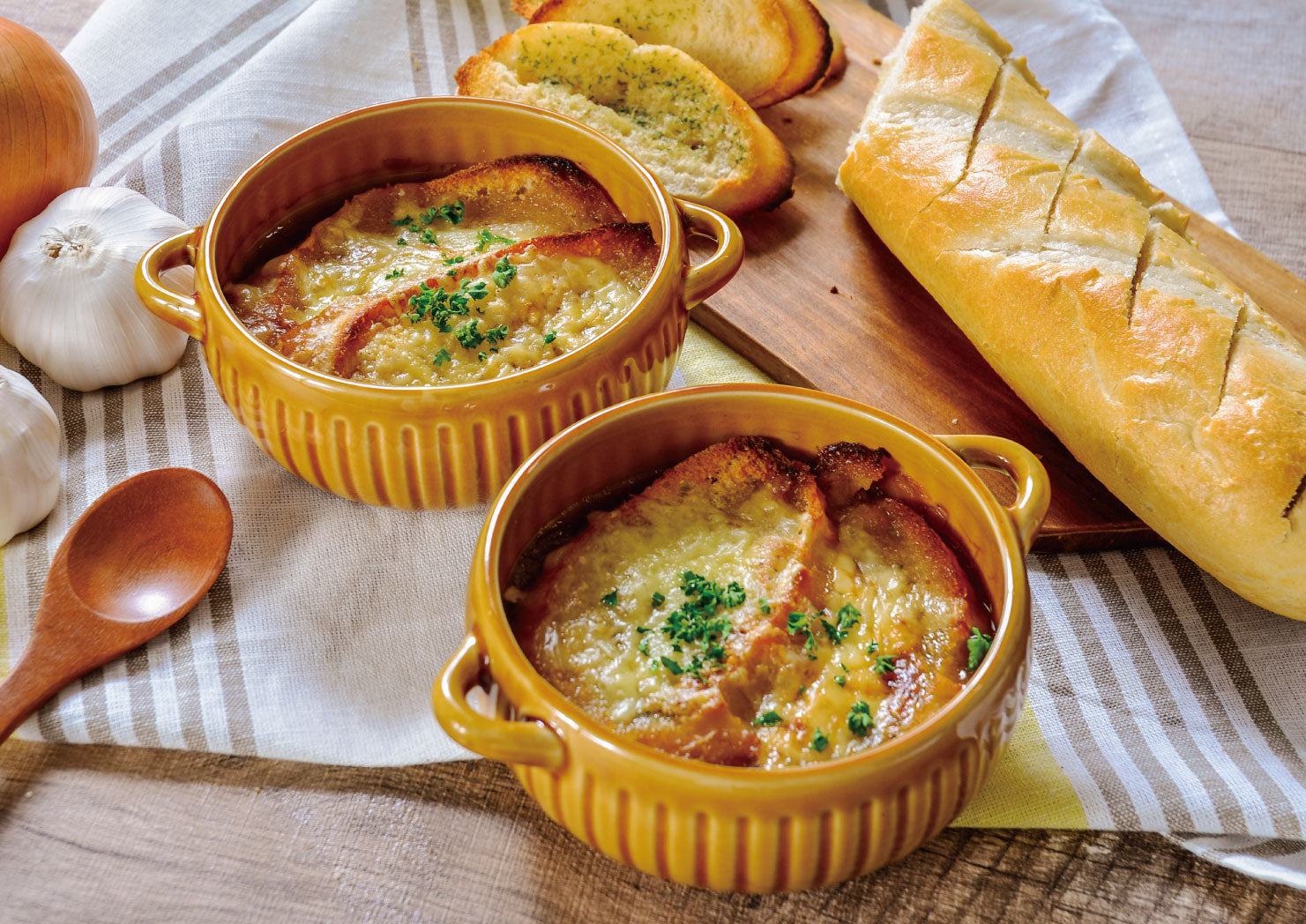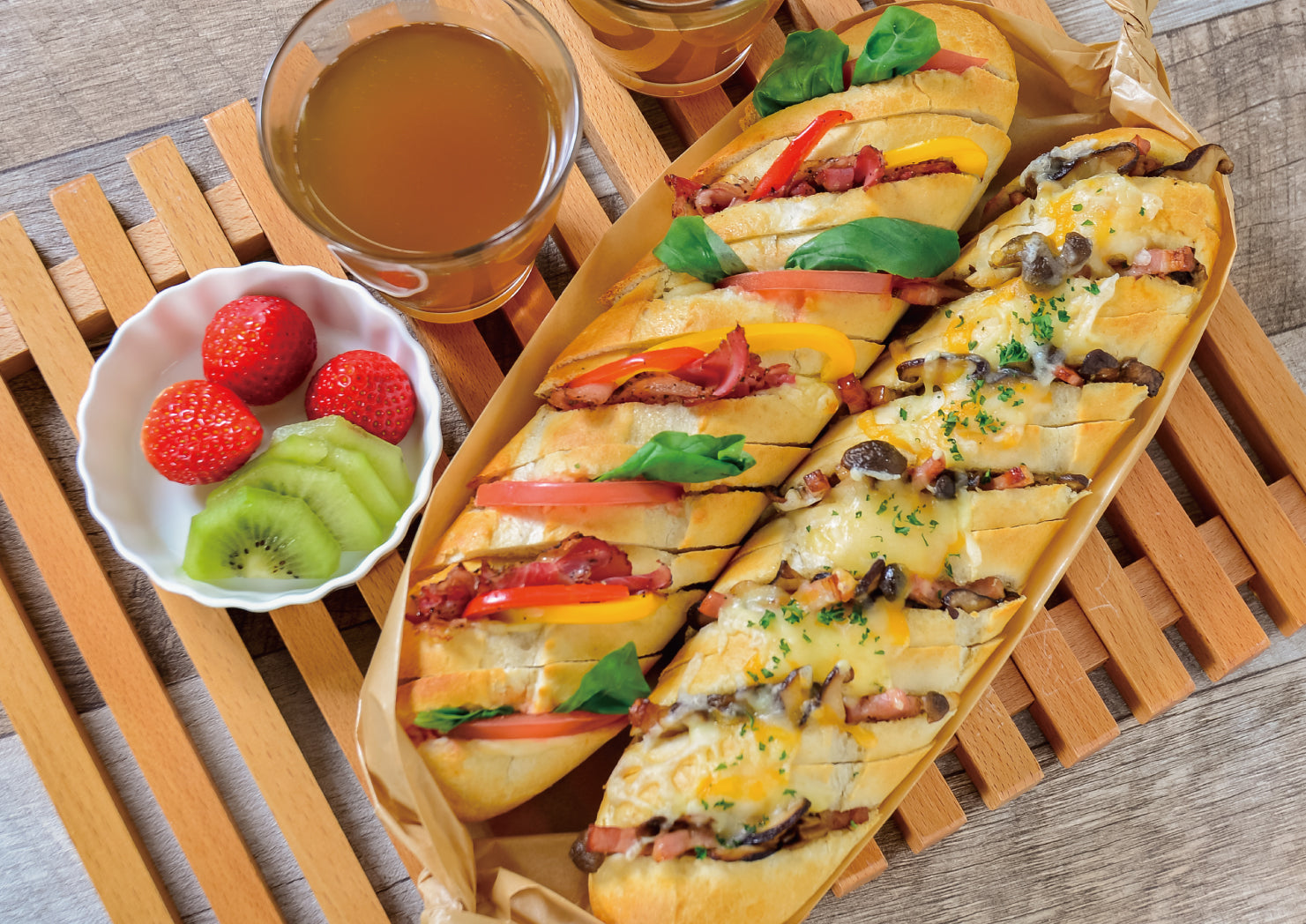 外はカリッと中はふんわりもちもちしたフランスパンに、切れ目を入れガーリックバターを塗りこみました。軽く焼くだけで本格的なフランスパンを楽しめます。